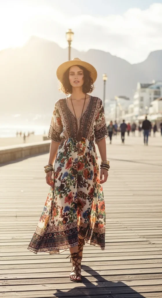Flowy bohemian maxi dresses with floral prints capture the free-spirited coastal energy. Gladiator sandals provide comfort for long walks along promenades and coastal markets.