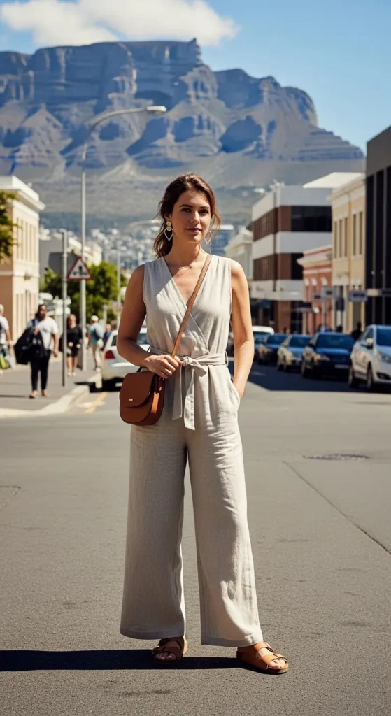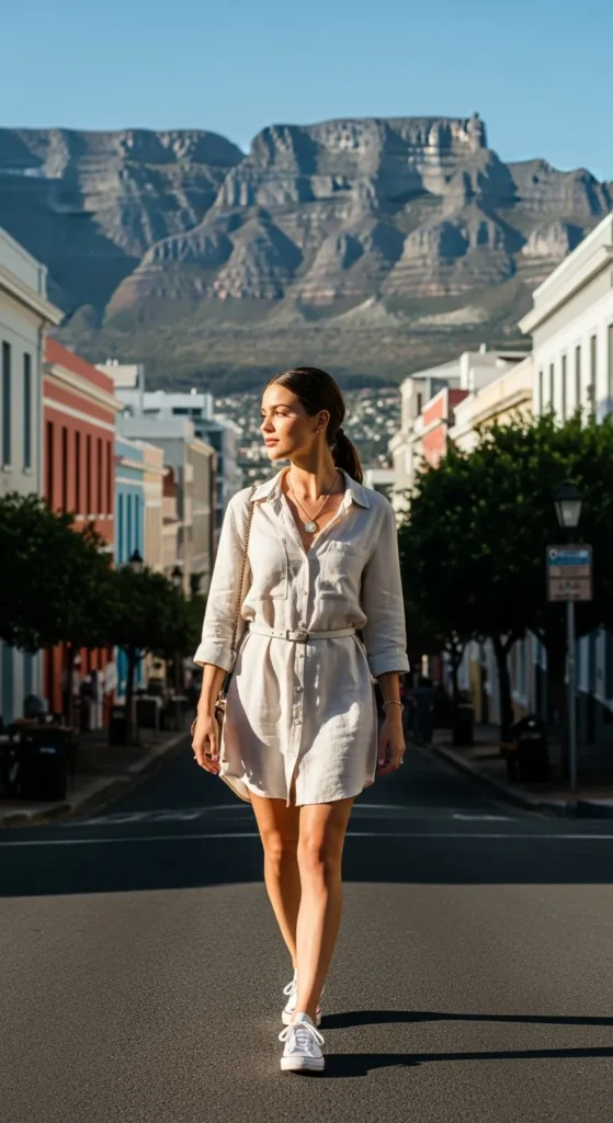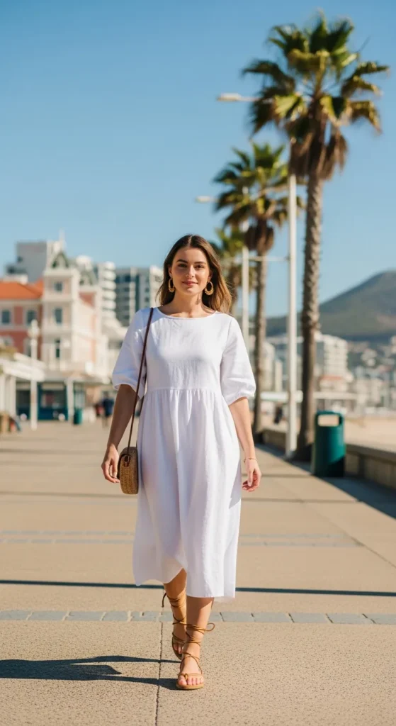 Flowing white linen catches the coastal breeze beautifully while keeping you cool. Pair with tan strappy sandals for effortless beachside walks. The simplicity lets Cape Town’s vibrant colors shine around you.