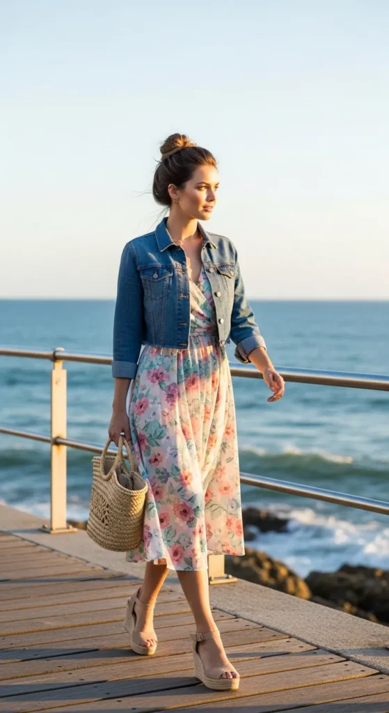 Layer a cropped denim jacket over a pastel floral midi dress for versatile day-to-evening style. Comfortable yet visually appealing.
