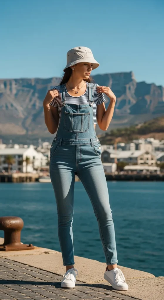 Casual yet chic, denim overalls paired with a classic navy-and-white striped crop top echo the nautical energy of Cape Town’s waterfront. Comfortable for exploring both markets and seaside cafes.