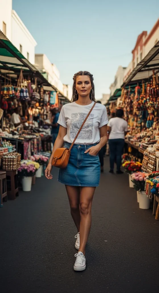 A graphic tee tucked into a mid-rise denim skirt is casual yet playful, perfect for street markets or harbor walks.