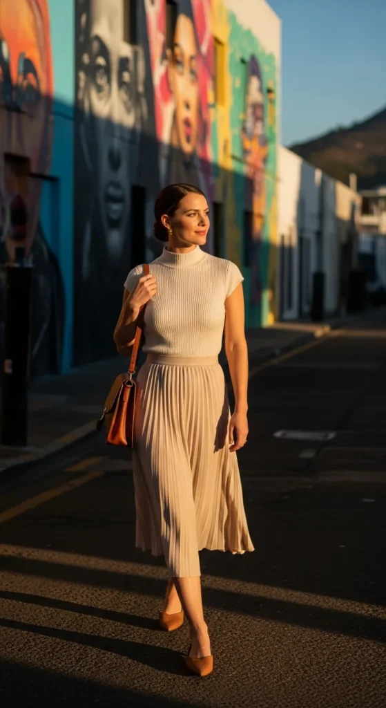 A fitted high-neck knit tucked into a pleated midi skirt balances structured and flowing textures. Ideal for gallery visits or sunset cafes.
