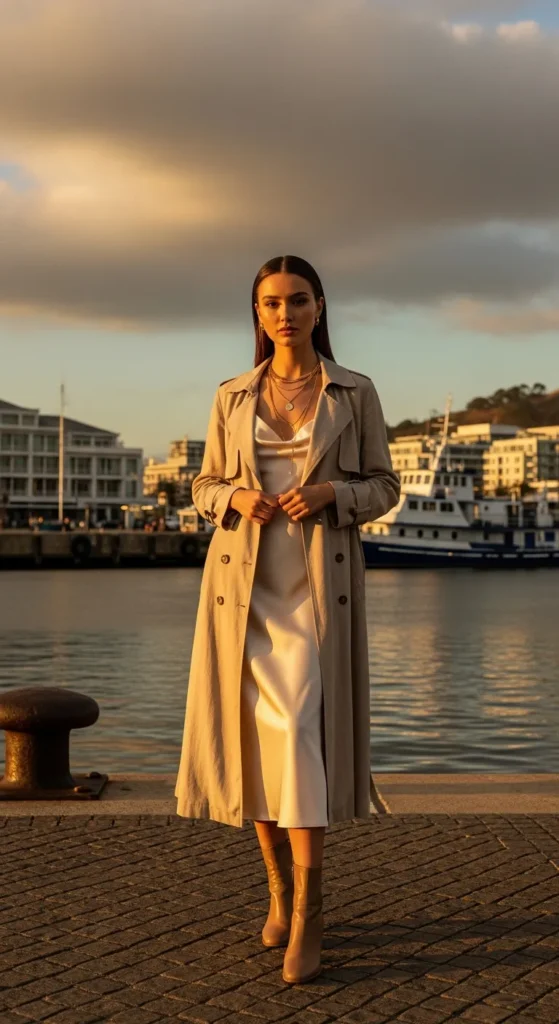 A lightweight trench coat layered over a silk slip dress balances chic elegance with practicality against coastal breezes.
