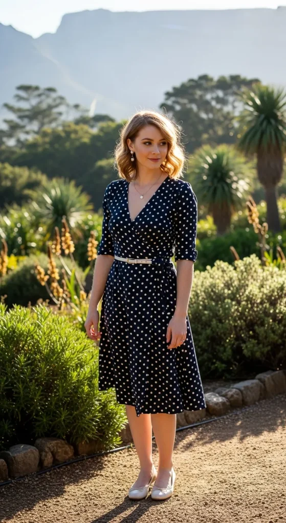 A playful polka dot wrap dress pairs with classic ballet flats for effortless elegance, ideal for garden strolls or cafes.