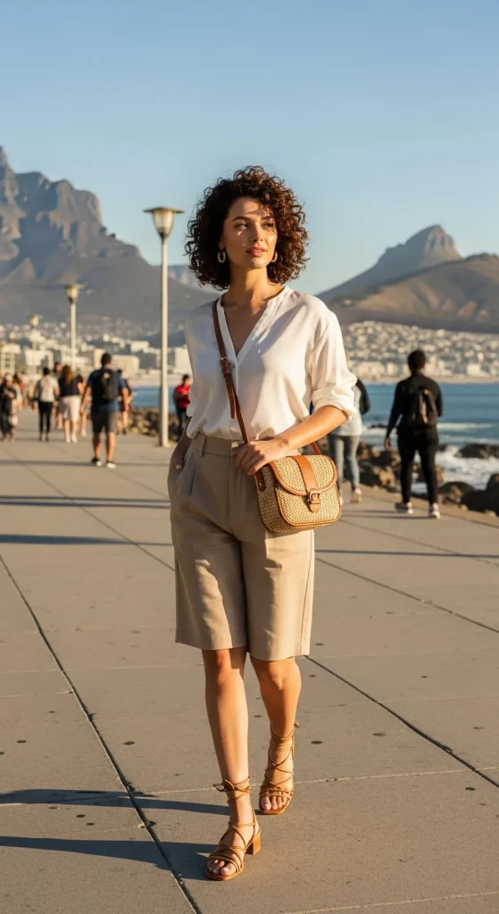 A silk camisole tucked into high-waisted tailored trousers combines comfort with an upscale coastal vibe. Soft neutral tones reflect Cape Town’s soft sunlight.