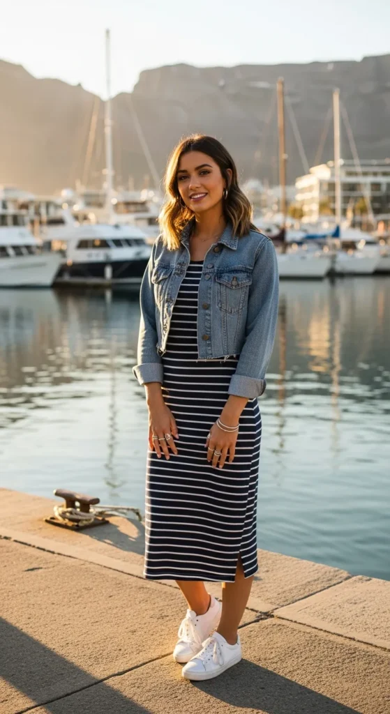 A striped midi dress with a cropped denim jacket is versatile for lunch by the waterfront or exploring colorful streets. Lightweight fabrics keep the ensemble breezy.