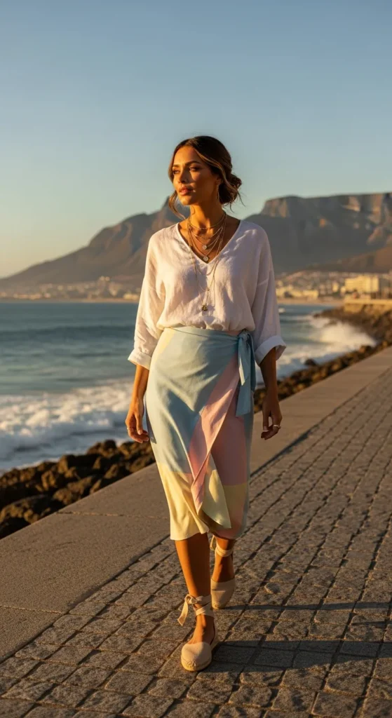 A flowing wrap skirt in pastel tones pairs with a crisp linen blouse for easy elegance. Espadrilles add a coastal flair while remaining practical for walking on sun-drenched streets.