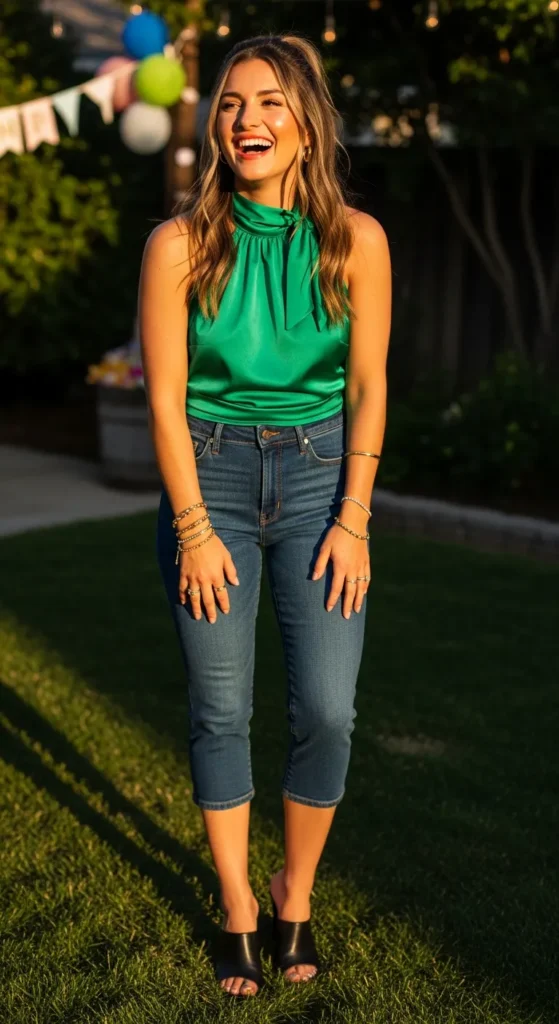 Denim capri pants paired with a satin halter top create a cool, casual-glam birthday outfit. The combination balances laid-back denim with elevated satin, making it ideal for outdoor birthday parties or casual gatherings.
