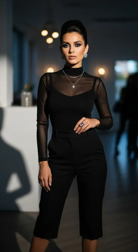 A high-neck mesh top styled with tailored capri pants creates a bold yet sophisticated birthday party outfit. The subtle transparency of the top adds intrigue while the structured pants maintain elegance.