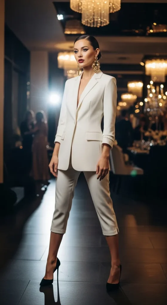 A coordinated off-white blazer and capri pants set creates a powerful yet stylish birthday look. It feels modern, structured, and perfect for women who want a confident, fashion-forward presence at their celebration.