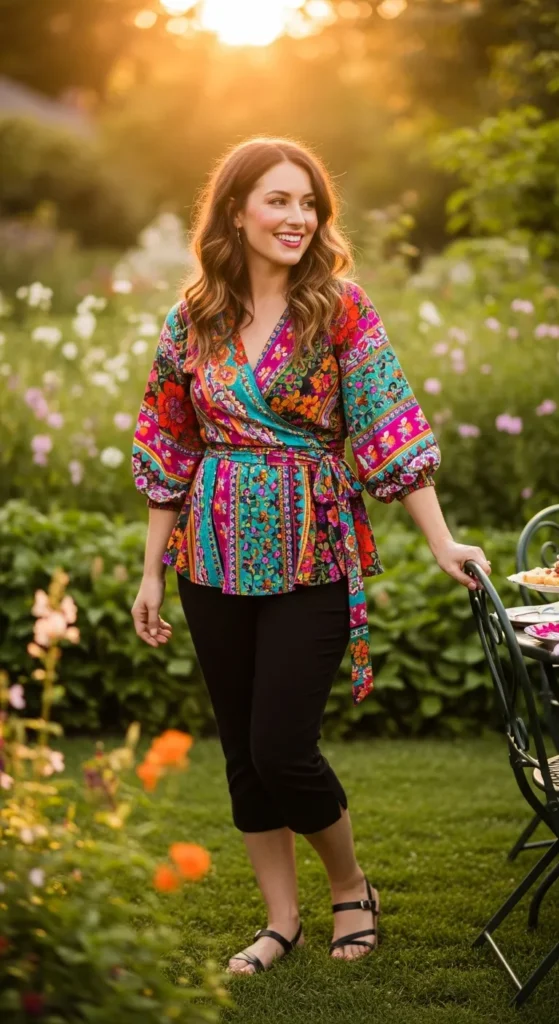 A lightweight printed wrap top styled with black capri pants creates a lively birthday outfit full of personality. The wrap detail flatters the waist while the print adds a playful celebratory touch.