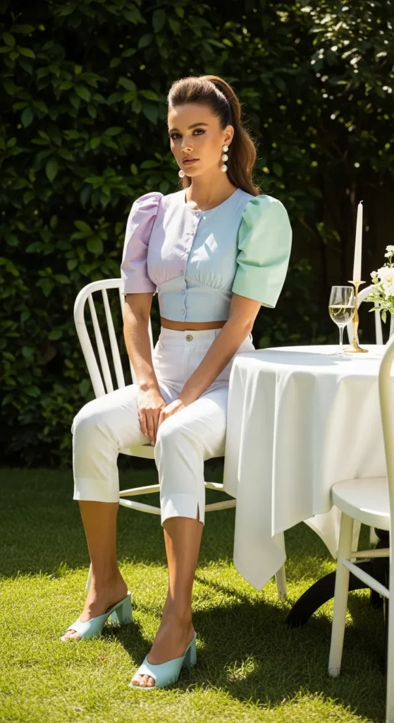 This airy puff sleeve crop blouse paired with crisp white capri pants feels playful and fresh for a daytime birthday brunch. The volume on top contrasts beautifully with the clean lower silhouette, giving a balanced and youthful celebration outfit.