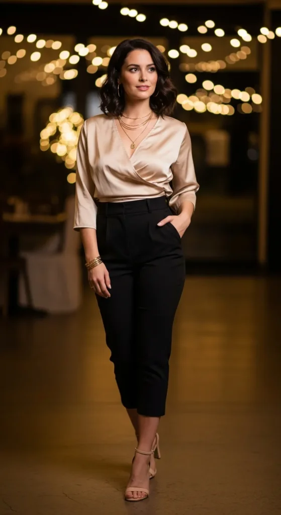 1. Satin Wrap Top with High-Waist Black Capri Pants