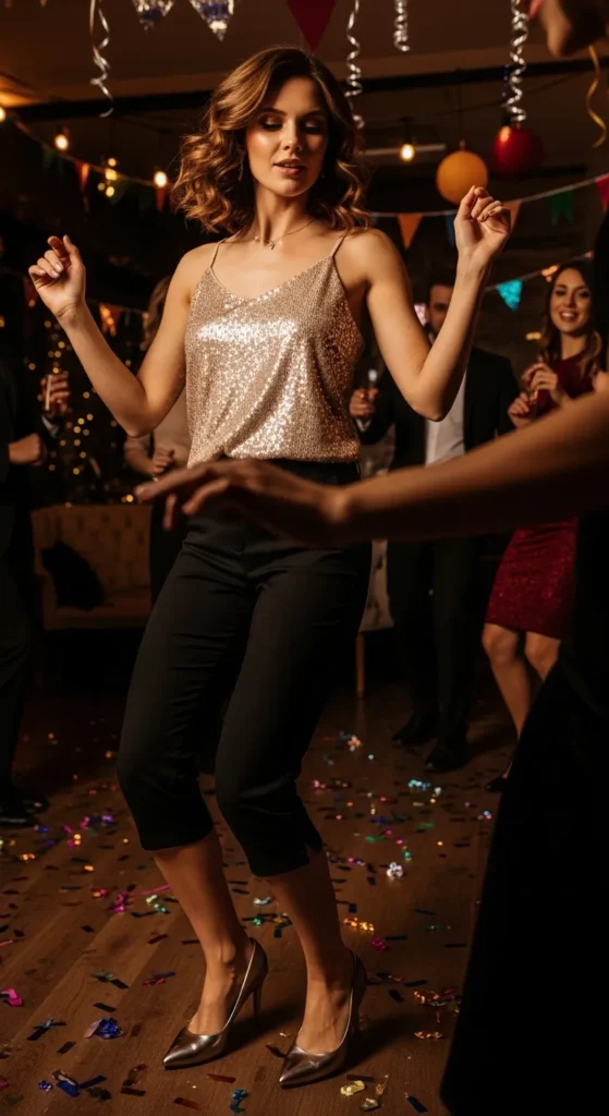 A subtle sequin cami paired with slim fit capri pants is perfect for a glowing birthday night look. The shimmer adds festive energy while the capri pants keep it modern and wearable for dancing and celebrations.