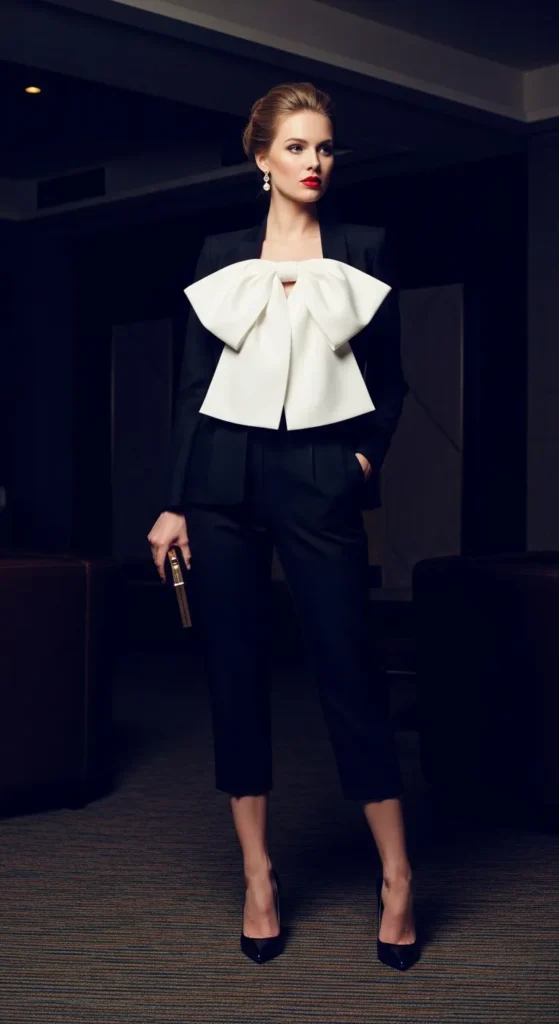 Stylist Suggestion: Add pointed heels and a sleek bun to highlight the neckline. A bold lip color will enhance the dramatic bow detail without overpowering the outfit.