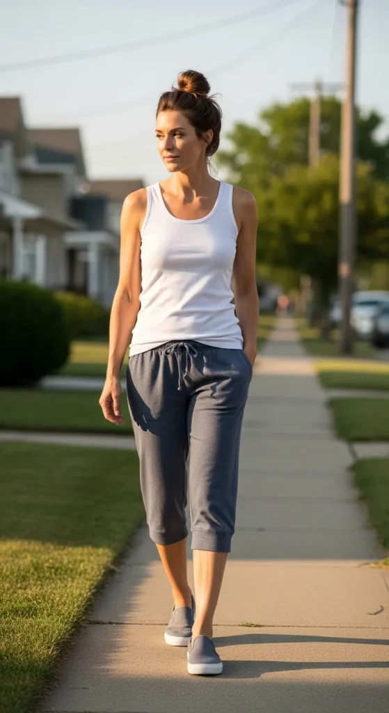 Capri joggers styled with a fitted tank create a balanced silhouette that feels both relaxed and flattering. This outfit is perfect for quick outings or casual meetups with other moms.