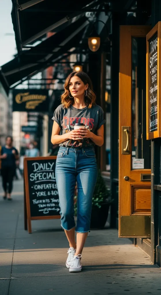 Denim capri pants styled with a relaxed graphic tee bring a casual, expressive edge to your outfit. It feels playful and personal, perfect for laid-back days with a touch of personality.