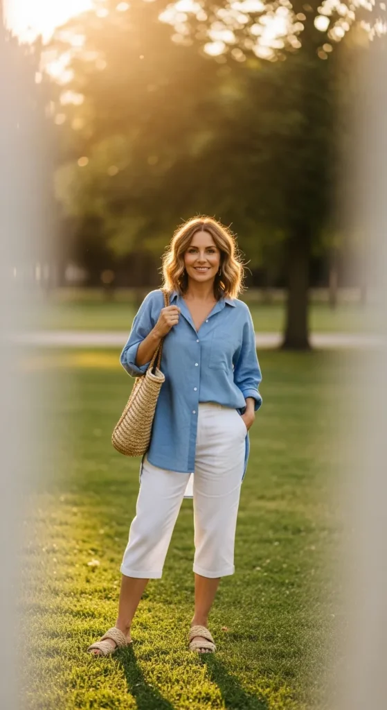 Light linen capri pants combined with a slightly oversized button-down shirt create a breezy, breathable outfit. It feels airy and polished, ideal for warmer days when comfort is your top priority.
