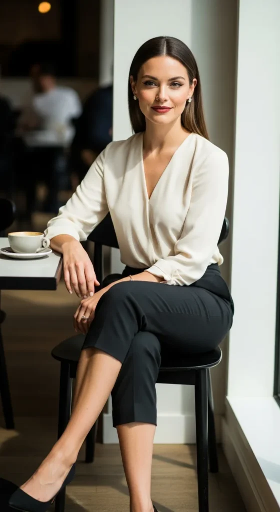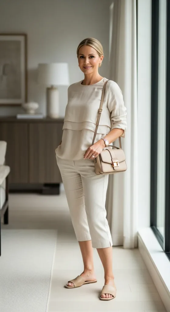 Tailored capri pants with a soft blouse create a refined yet comfortable outfit. This look works beautifully for school meetings or casual workdays where you still want to feel put together.