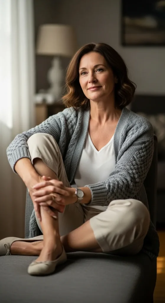 Neutral capri pants styled with a soft cardigan and basic top create a cozy, layered outfit. This look feels comforting yet presentable, especially during slightly cooler mornings or evenings.