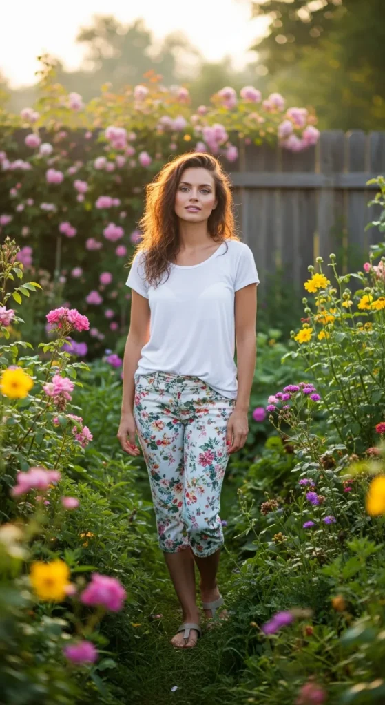 Printed capri pants paired with a simple solid tee create a fun, lively outfit without overwhelming your look. It’s perfect for days when you want a little brightness without extra effort.