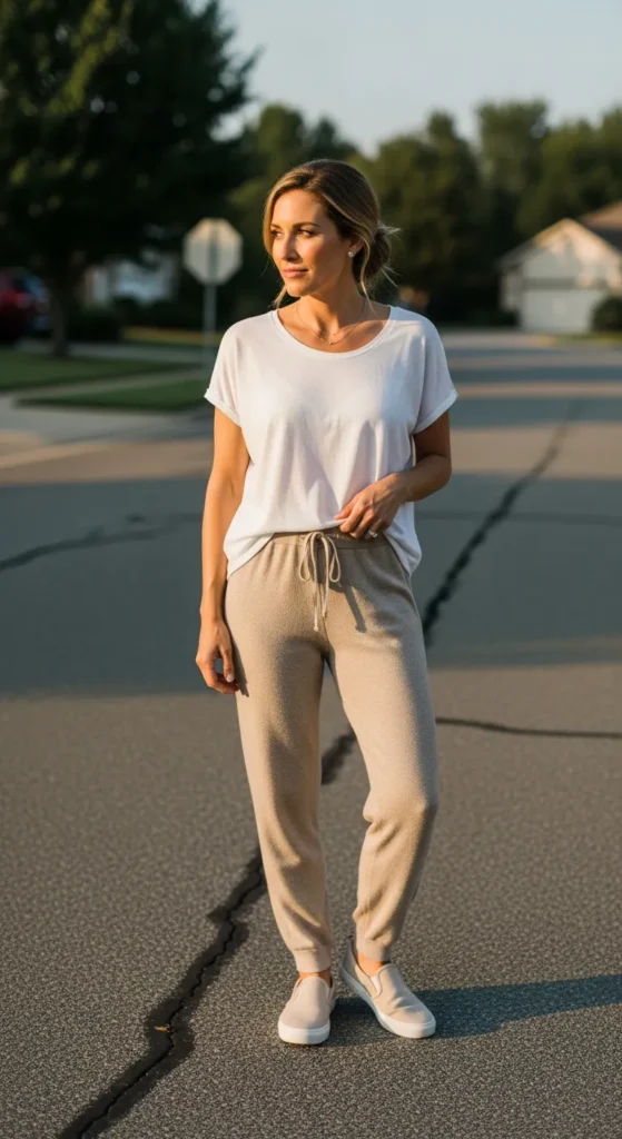 Stylist Suggestion: Add slip-on sneakers and a messy bun. The fitted top balances the joggers while the relaxed styling keeps everything easy and approachable.