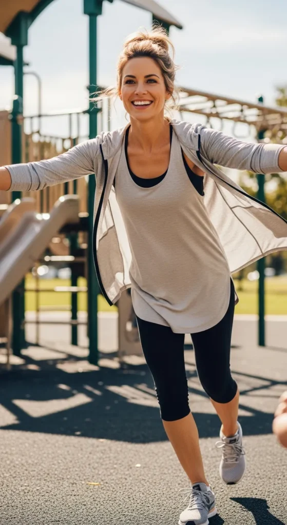 Stretchy capri leggings paired with a longline tank top give you freedom to move while maintaining a sleek silhouette. This look transitions seamlessly from errands to light workouts or playground time.