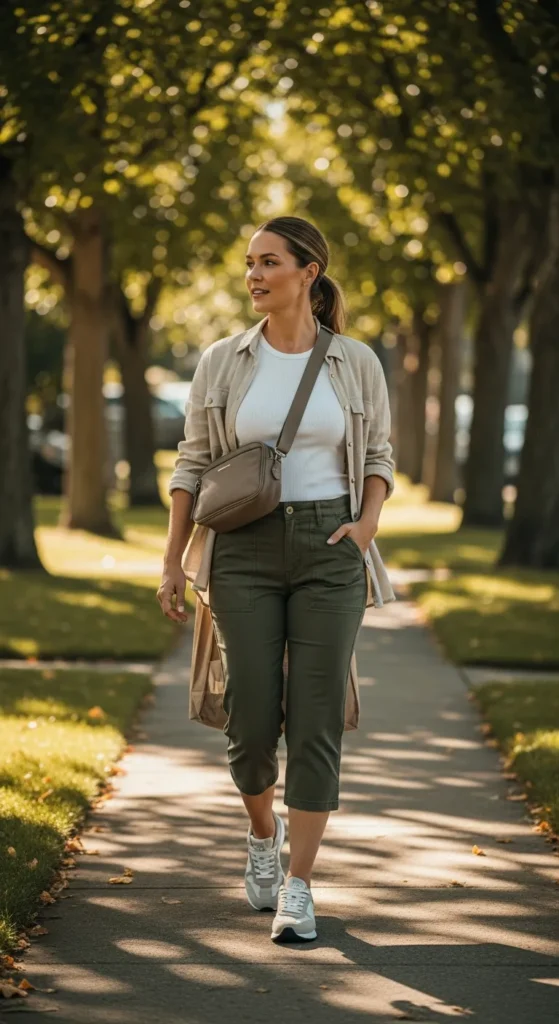 Utility-style capri pants paired with a simple tank and lightweight overshirt create a practical yet stylish outfit. The pockets and structure make it ideal for moms who need functionality without sacrificing style.