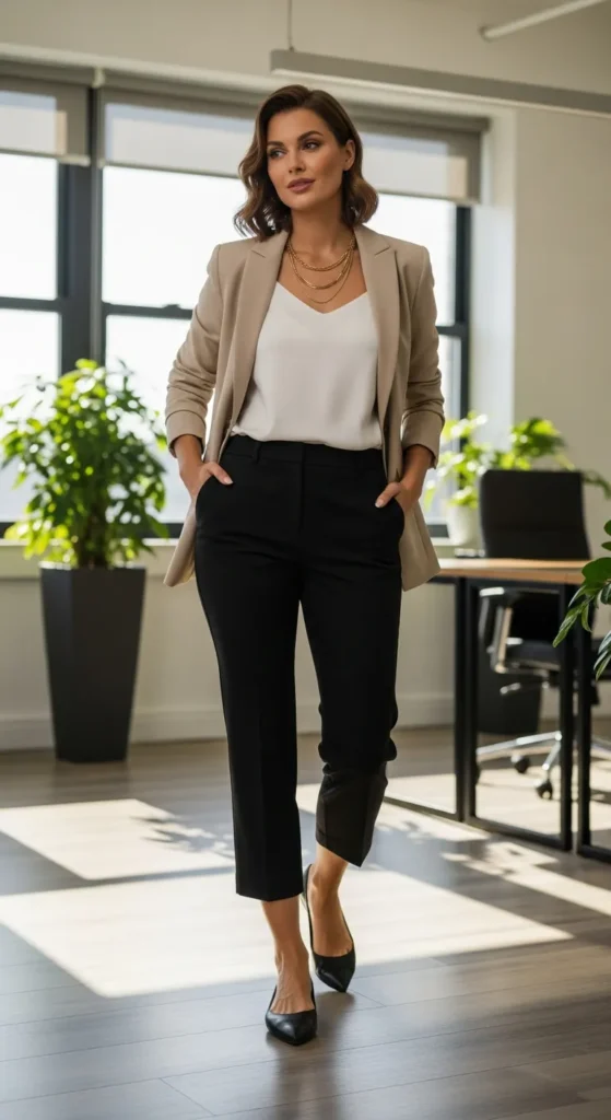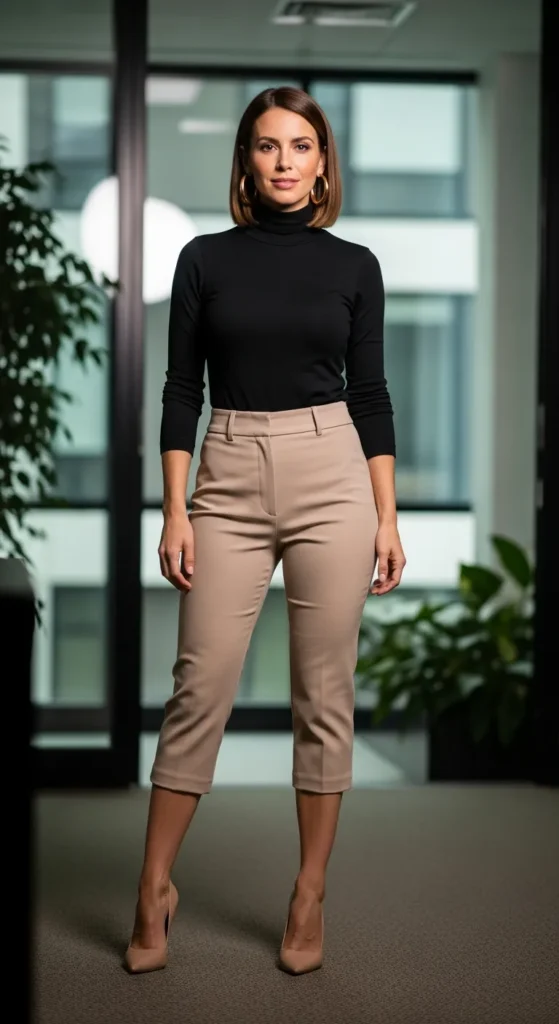 A fitted black turtleneck paired with beige capri pants offers a timeless, elegant office silhouette. It’s sleek, minimal, and perfect for transitional seasons.