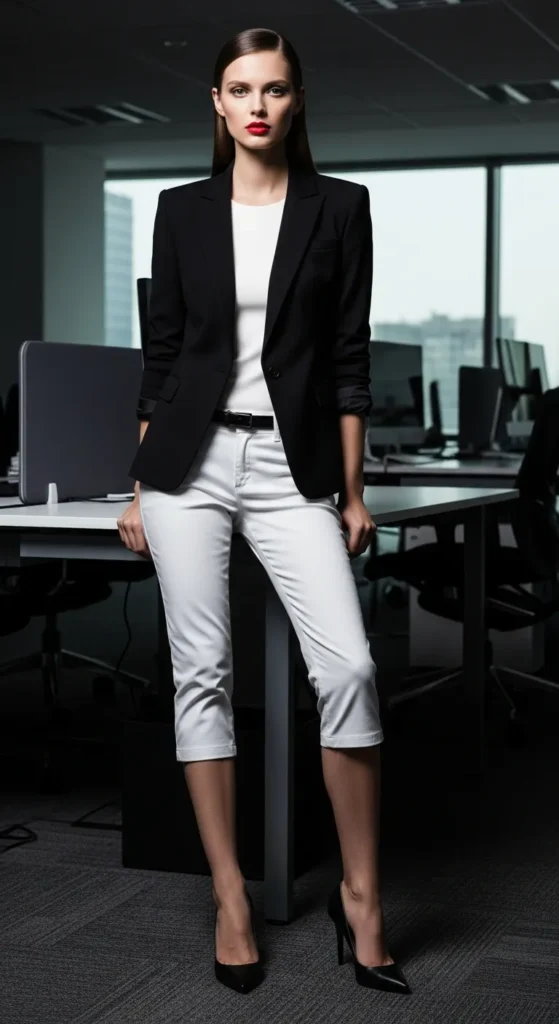 A black fitted blazer over white capri pants delivers a strong monochrome contrast that feels bold yet controlled. It’s ideal for high-impact office days or important meetings.