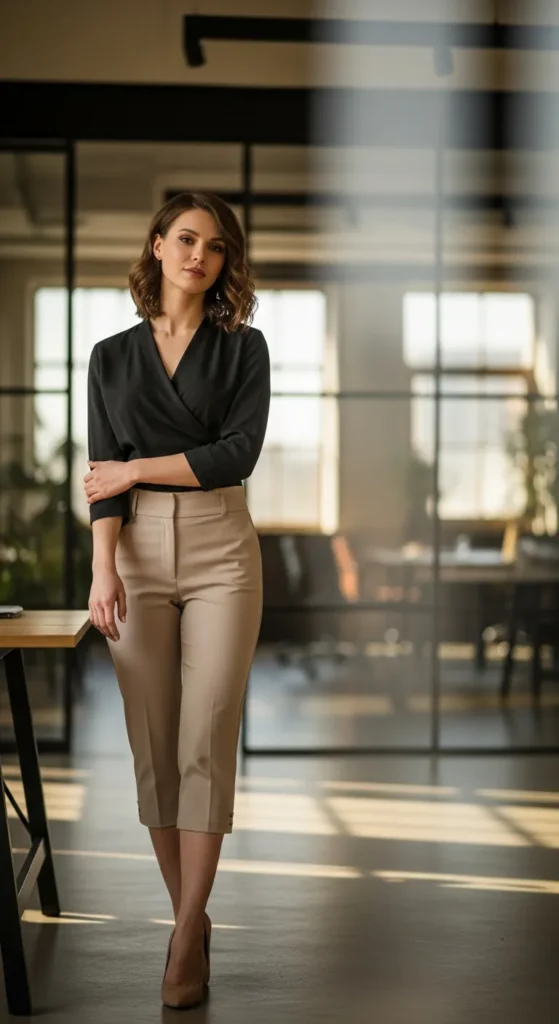 A black wrap-style top with beige capri pants offers a flattering, slightly dressier office look. The wrap detail adds shape while maintaining professionalism.