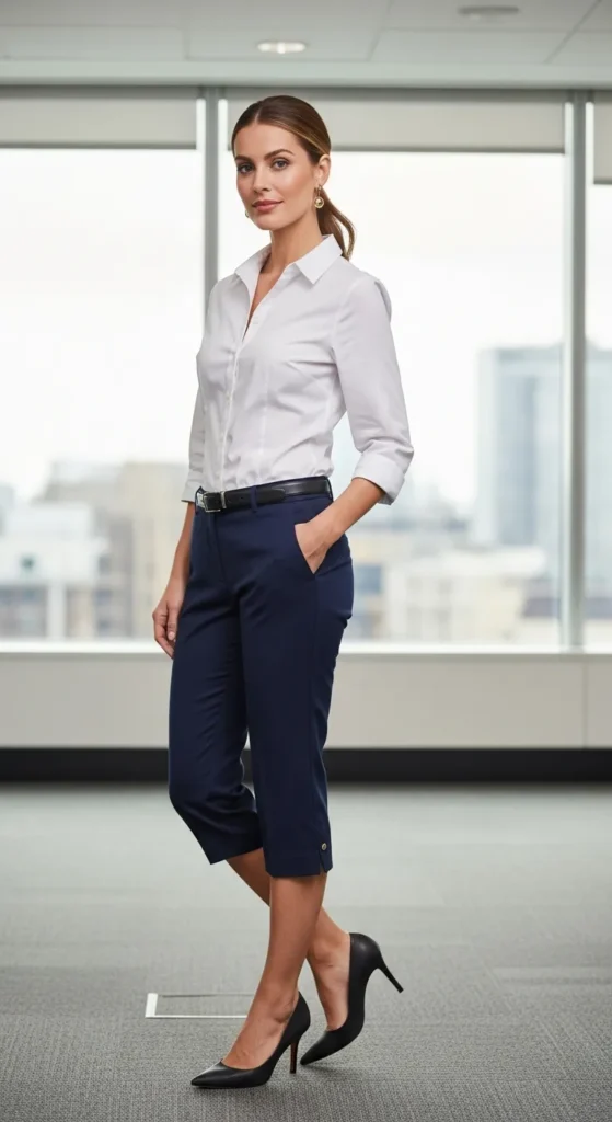 A crisp white button-down tucked into navy tailored capri pants creates an instantly professional silhouette. The contrast feels sharp yet approachable, perfect for meetings or presentations where confidence matters most without overcomplicating your morning routine.