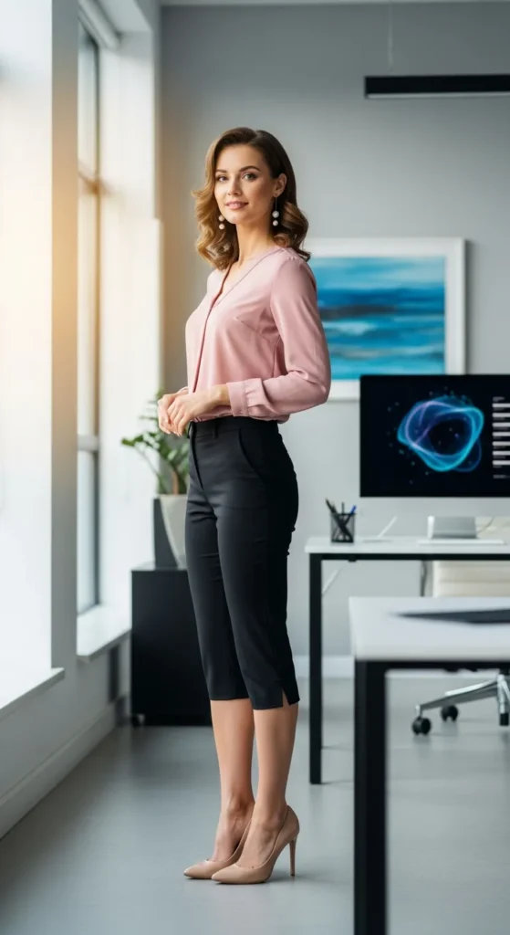 A dusty rose blouse paired with black capri pants creates a soft yet grounded office combination. It’s feminine, calm, and perfect for daily professional wear.