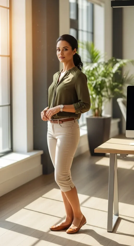 An olive blouse with beige capri pants feels earthy and refined, perfect for calm, focused work environments. It brings a subtle personality without overwhelming the professional tone.