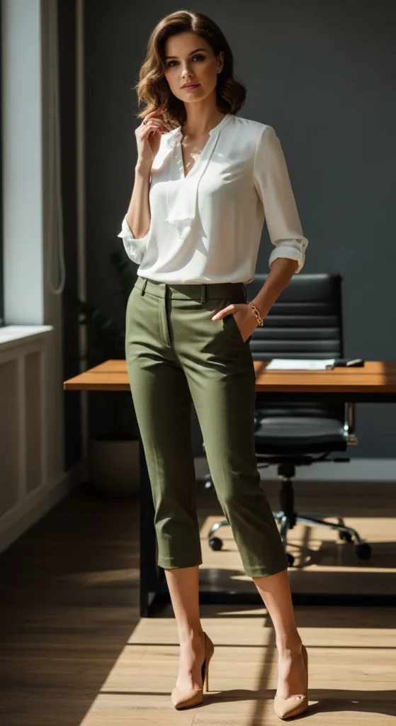 A flowing white blouse paired with olive green capri pants creates a grounded, nature-inspired office look. It feels calm and composed, perfect for creative or semi-formal workplaces.