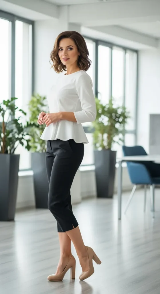 A white peplum top paired with black capri pants adds subtle femininity to office dressing. The structured waistline creates shape while keeping everything professional and clean.
