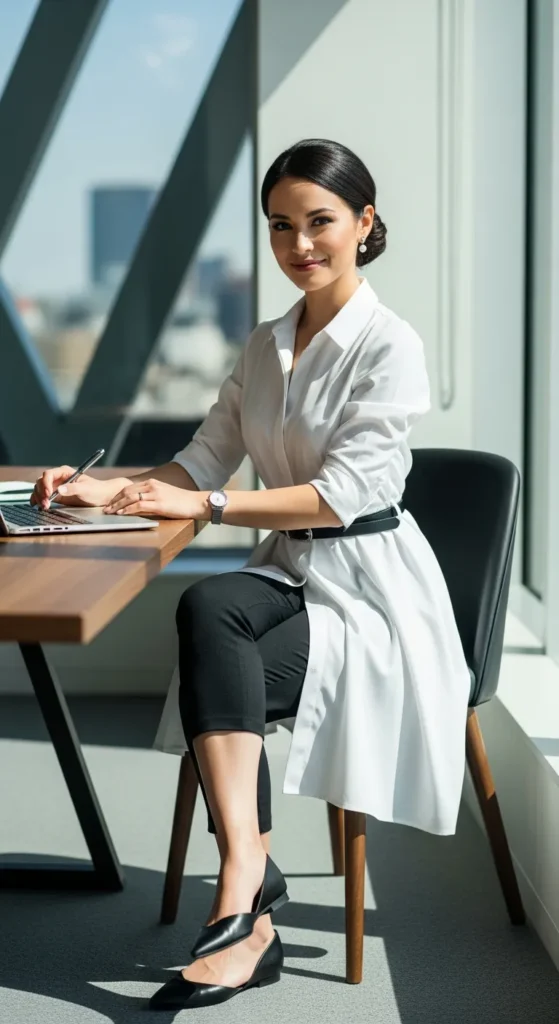 A long white shirt styled over slim capri pants creates a layered, fashion-forward office look. It feels creative yet still refined for workplace settings.