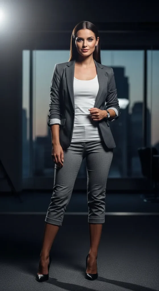 A white fitted tank layered under a structured blazer with grey capri pants creates a sharp layered office outfit. It balances simplicity with authority.