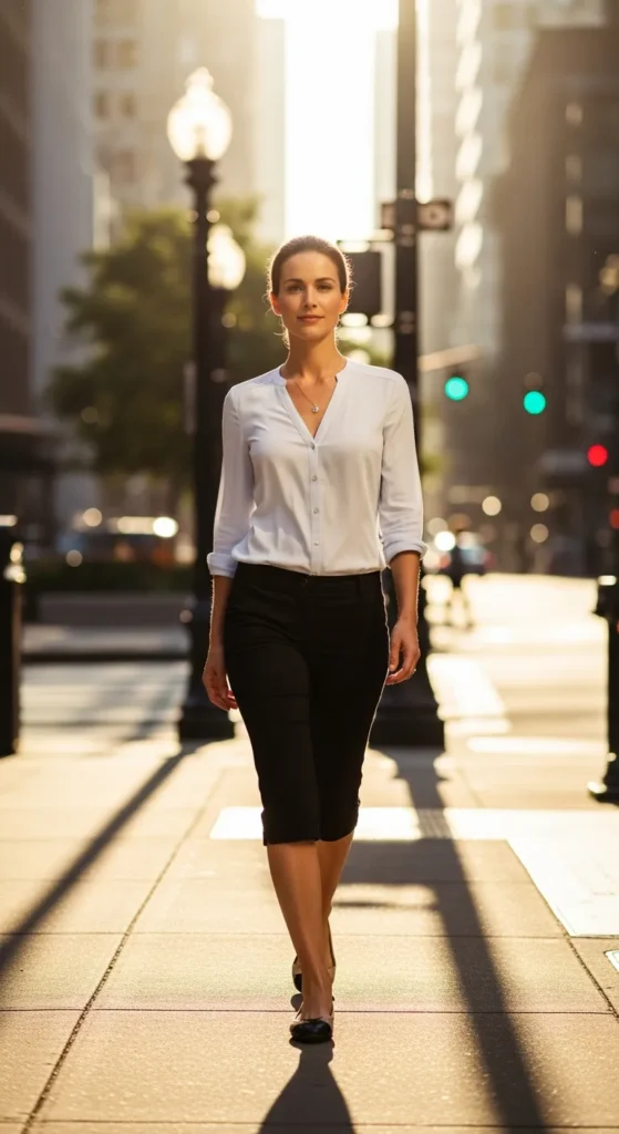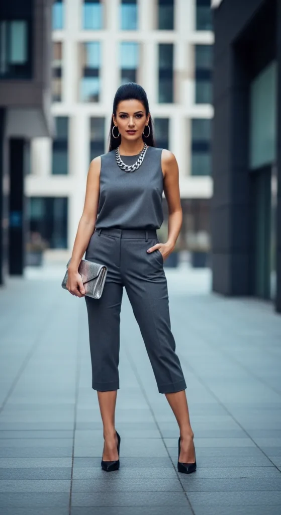 A sleeveless blouse paired with tailored capris feels sleek and confident. It’s a perfect warm-weather outfit that still feels structured.