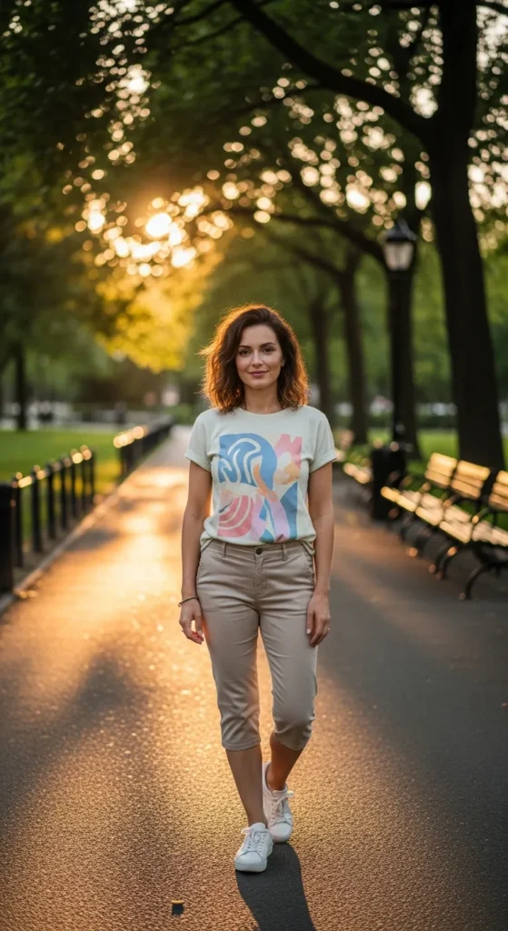 A subtle graphic tee paired with neutral capris adds personality while staying age-appropriate and relaxed. It’s playful without being loud.