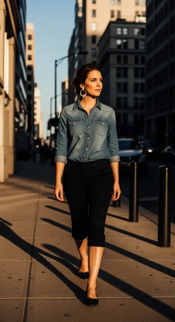 A chambray shirt paired with black capris creates a beautiful contrast between soft denim texture and sleek tailoring. It’s a balanced look that works across seasons.