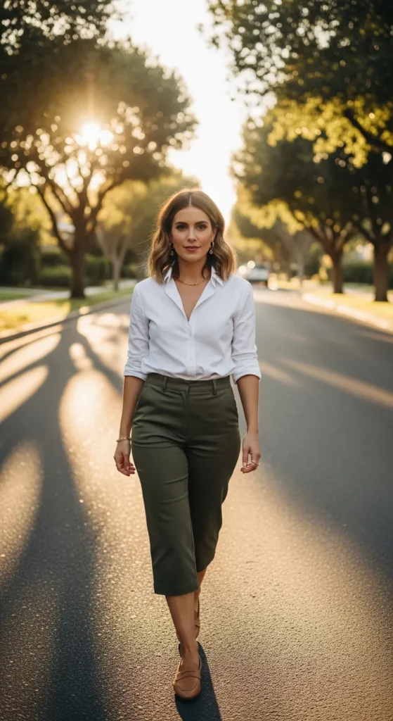 A crisp white shirt tucked into olive capri pants creates a clean, grounded look that feels both relaxed and polished. The earthy tones balance brightness, making it perfect for daytime outings or casual work settings.