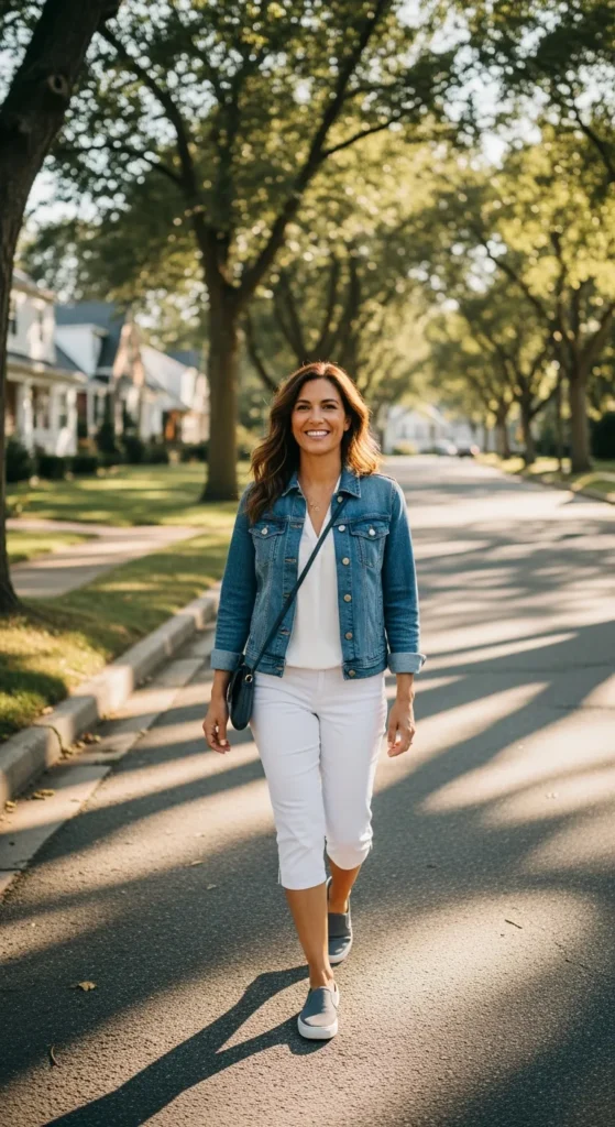 A classic denim jacket layered over white capris creates a fresh, everyday look with just the right amount of structure and ease.