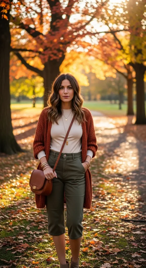 Layering earth tones like brown, rust, and cream with capris creates a grounded, rich look that feels warm and intentional.