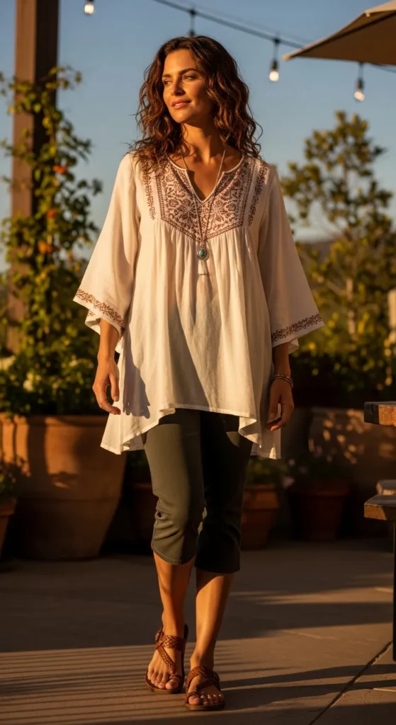 A flowy tunic balanced with slim capris creates a flattering silhouette that feels comfortable yet refined. The movement adds softness to the overall look.