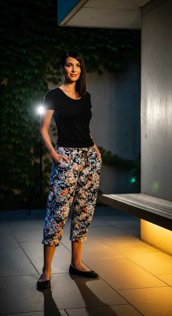 A simple black tee paired with printed capris strikes a perfect balance between understated and expressive style.