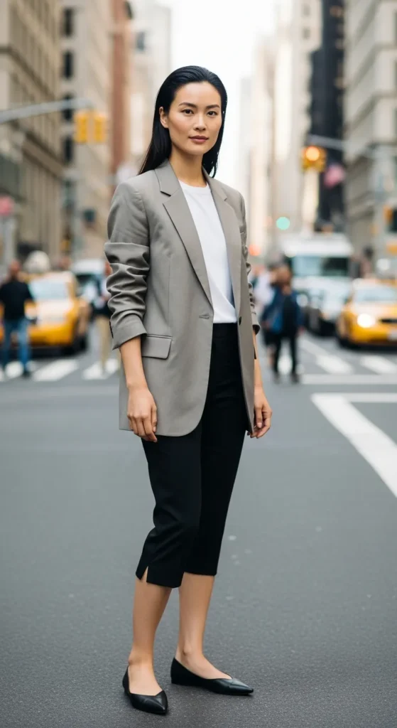 Layering a relaxed blazer over a simple tee with capris adds instant sophistication without stiffness. It’s ideal for casual meetings or polished daywear.