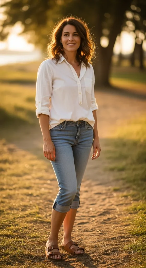 A relaxed cotton shirt paired with slightly rolled capri hems creates an easygoing yet styled appearance perfect for casual days.