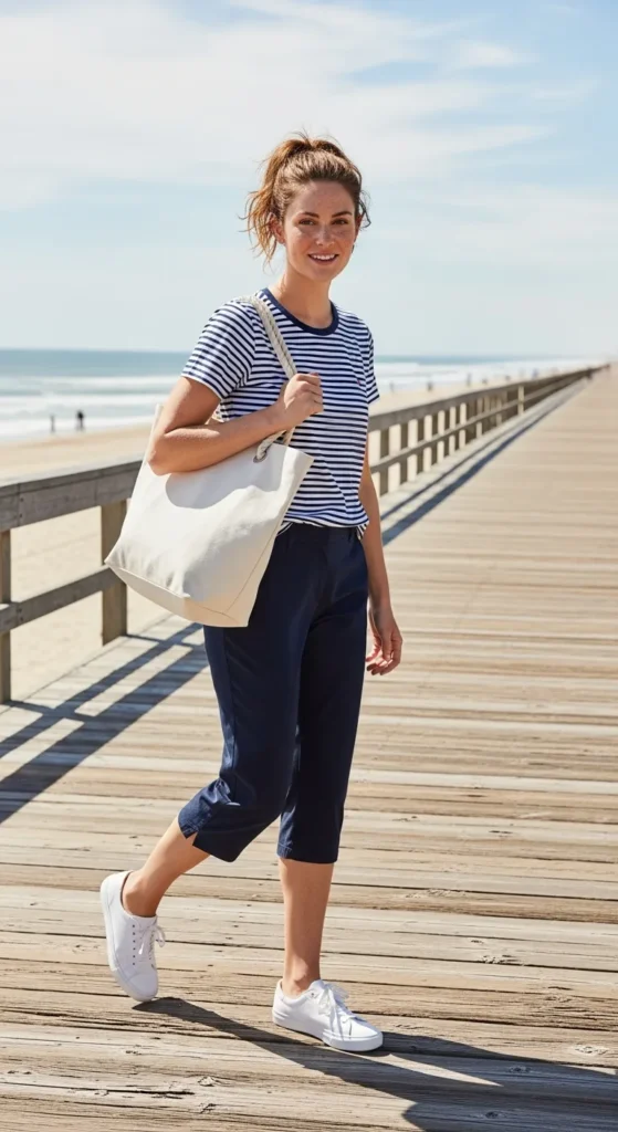 A classic striped tee with navy capris gives a timeless nautical vibe. It feels fresh, youthful, and perfect for casual days without appearing overly styled or forced.