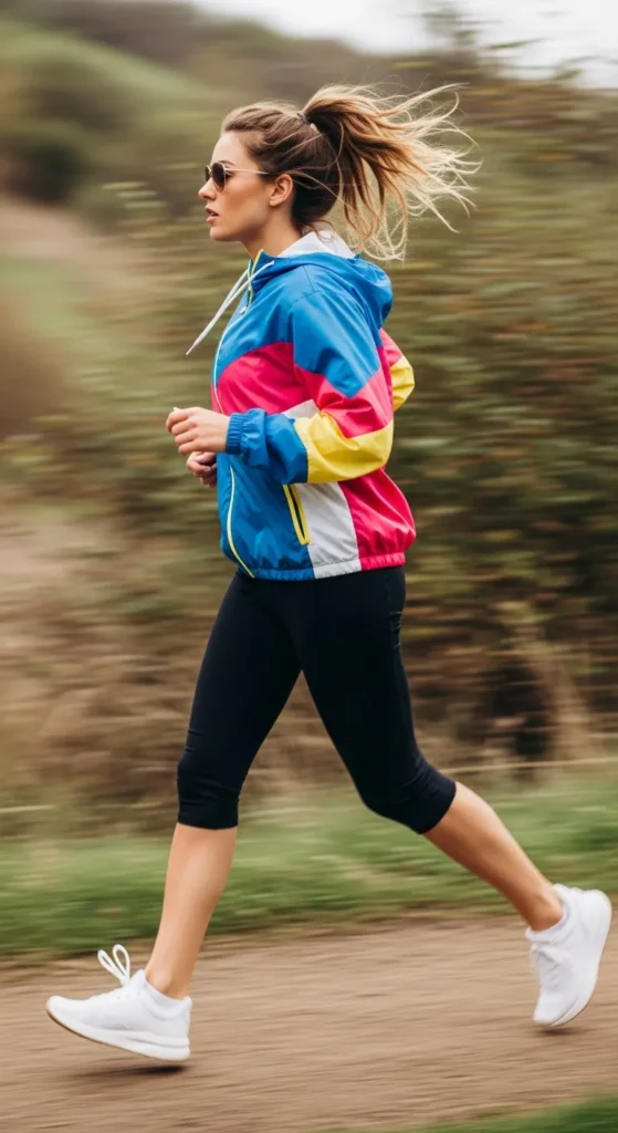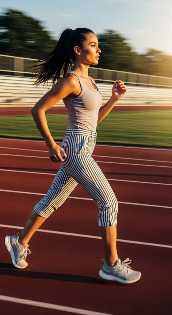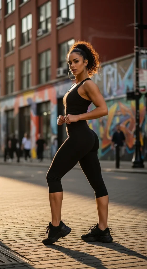High-waisted capri pants with a fitted crop top and sleek running sneakers create a confident, active look. It’s flattering, supportive, and ideal for days when you want to feel strong and energized.